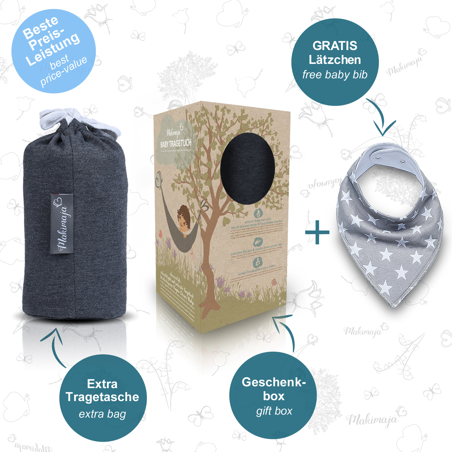 With our baby sling, you will receive a free storage bag and a cute baby bib, all packed in a beautiful gift box – designed with love.